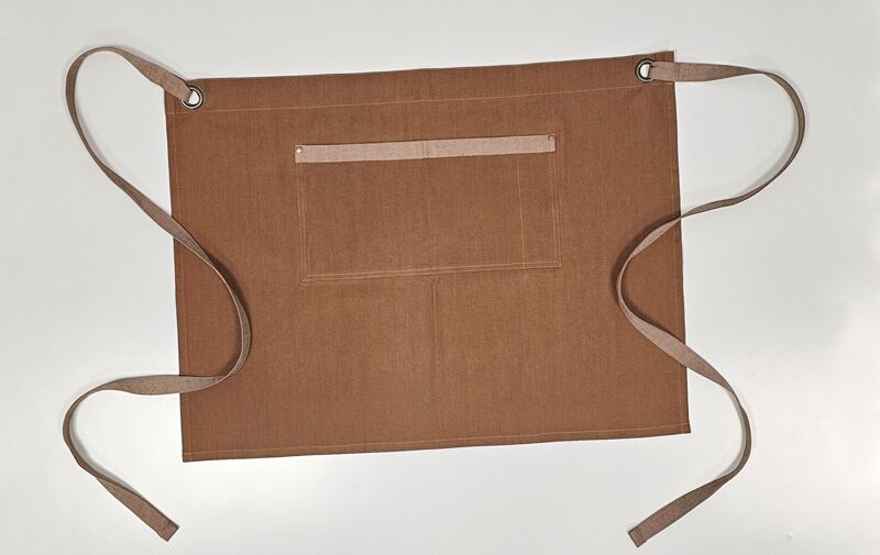 A shorter bar apron in premium rust-coloured denim with contrast trim and ties, offering a refined contemporary look suited to lounge and cocktail service.